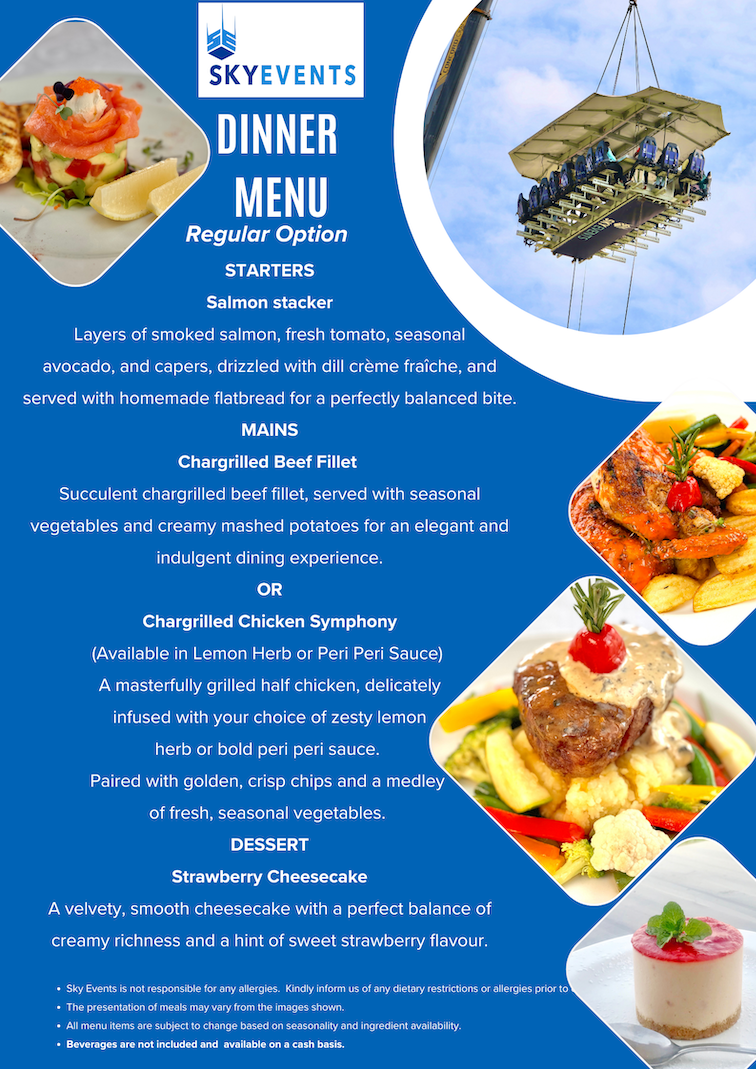 Guests will arrive 45 minutes before “take off” where they are taken through the registration process. Guests are then taken individually to their seats where they are fastened in their seats by a three point safety belt. Once all the safety checks are complete starters are served and we “take off” for our first session in the sky, this lasts approximately half an hour and the table is then brought back to ground where guests are welcome to take a comfort break. The main course and dessert is then loaded and we once again take off where guests will enjoy a further hour in the sky enjoying their main meal and mouth watering dessert.