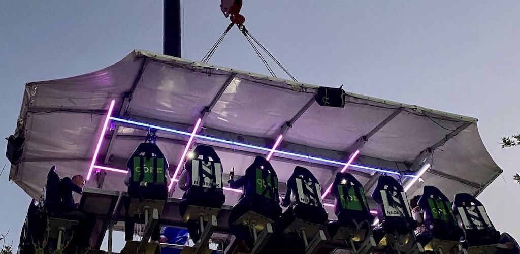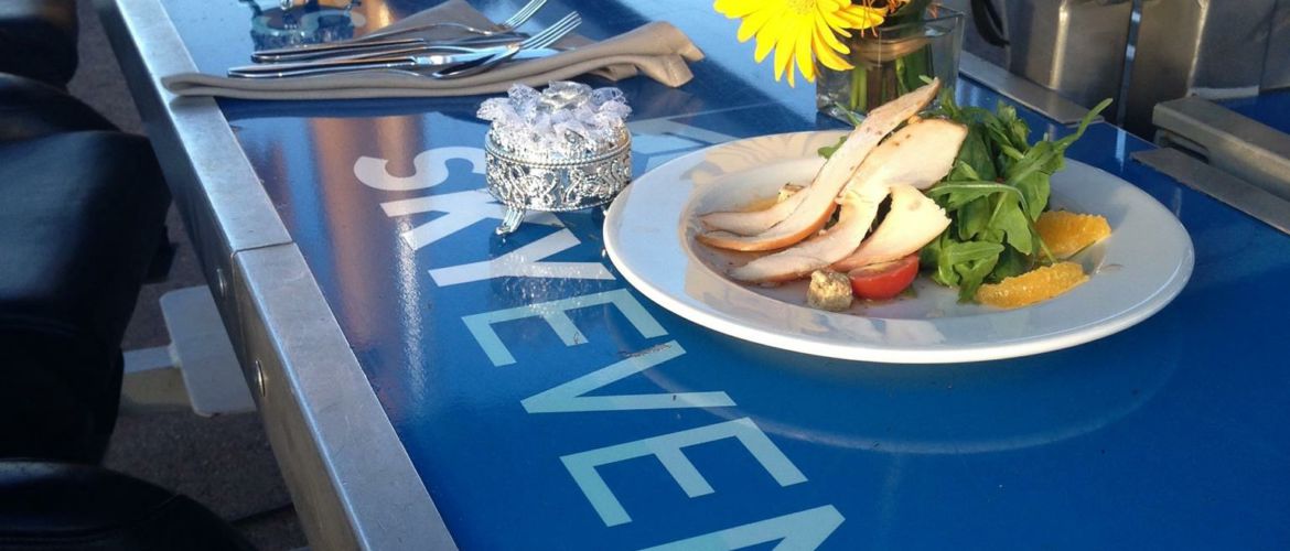 Guests are asked to arrive 45 minutes before “takeoff” to complete the registration process. After registration, they are invited to their seats and secured with a four-point safety belt. Once the safety briefing and checks are complete, meals are served and we “take off” for our session in the sky. The experience lasts between 45 and 90 minutes, depending on the option booked. If a guest needs a comfort break, we lower the table at any point during the sky dining session and then take off again.